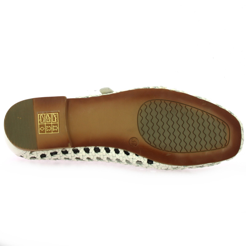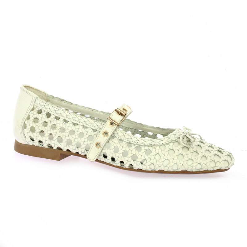 Ce babies au cuir blanc cassé séduit par son travail de tressage ajouré, offrant une texture artisanale et une grande respirabilité.