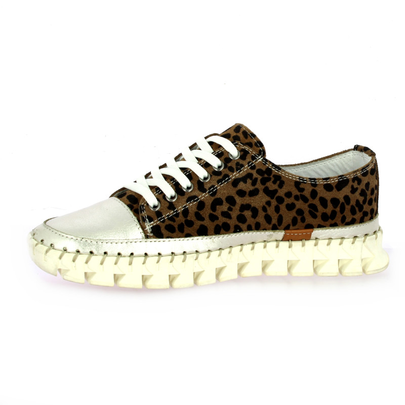 Cette basket signée K.Mary affirme son caractère avec un imprimé léopard audacieux sur cuir velours.