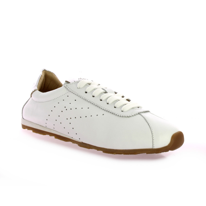 Confectionnée dans un cuir blanc de qualité, elle se distingue par ses perforations latérales formant un motif délicat et sa languette arrière contrastante.
