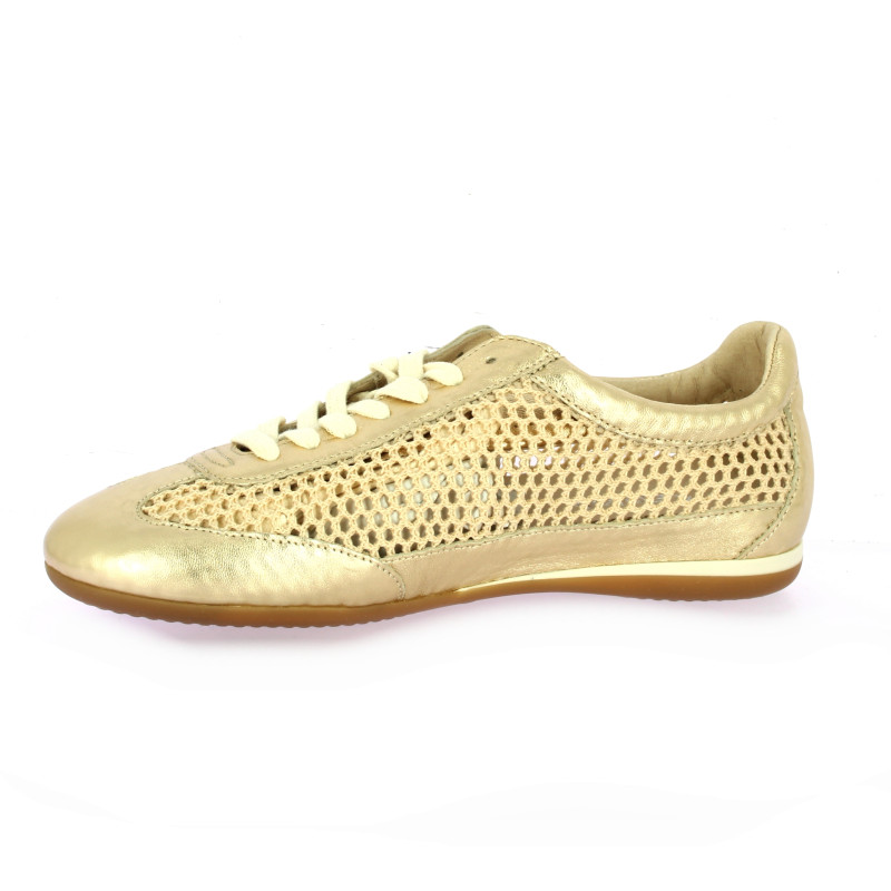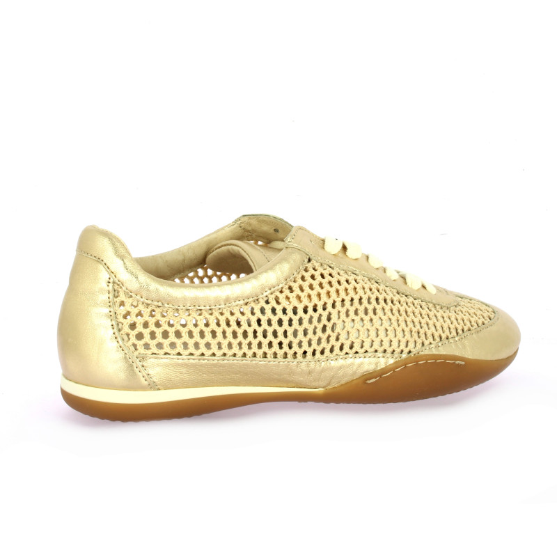 Cette basket basse Reqins en cuir doré au fini platine allie une esthétique sportive à un design résolument estival.