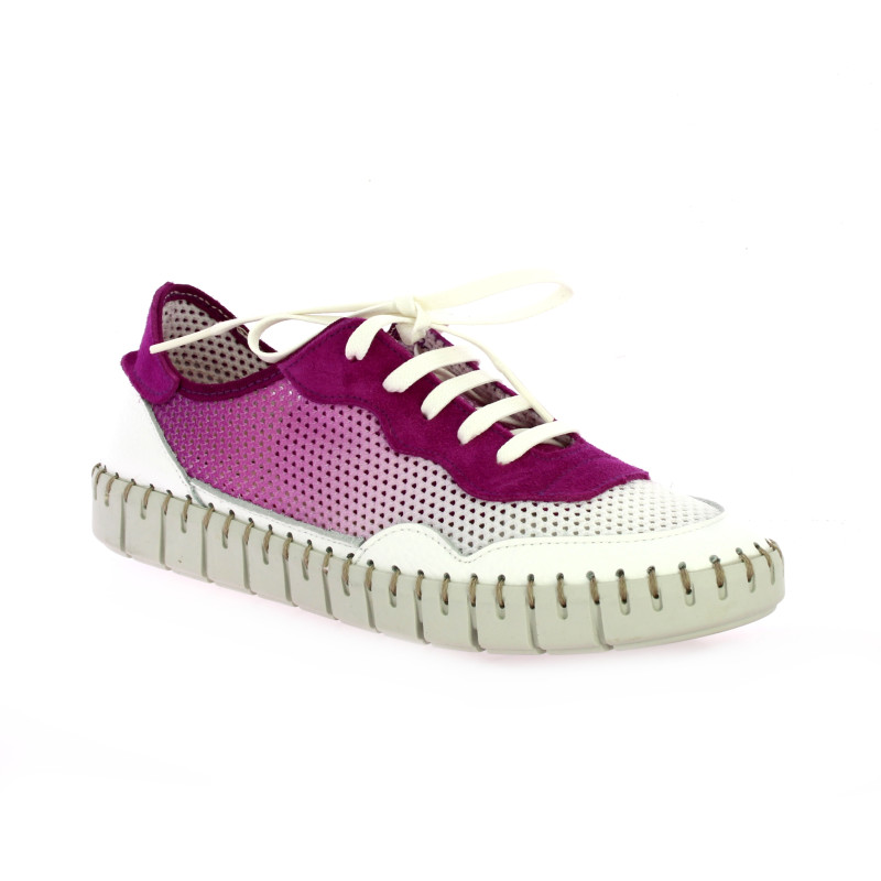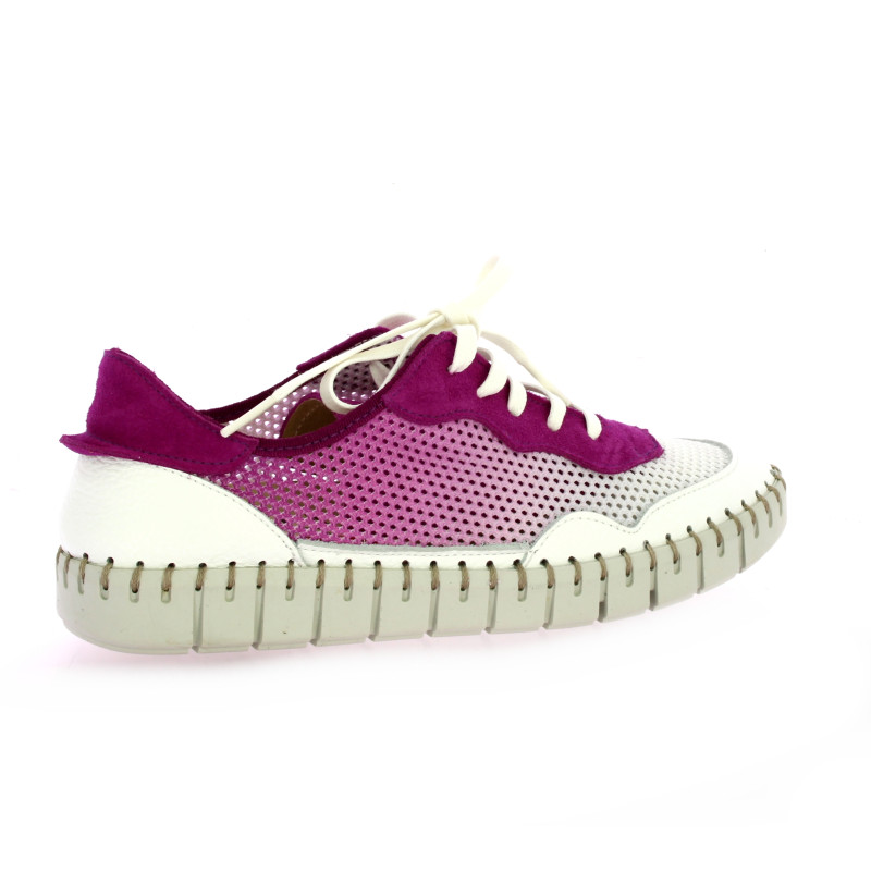 Cette basket de la marque Fabiolas en cuir velours fuchsia et cuir blanc se distingue par son allure artisanale et respirante.