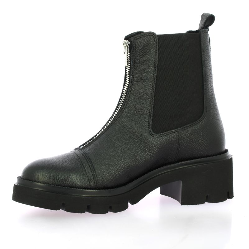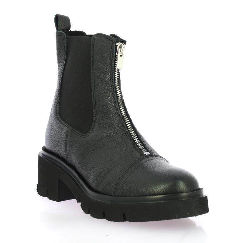 Boots en cuir noir, silhouette robuste et contemporaine.