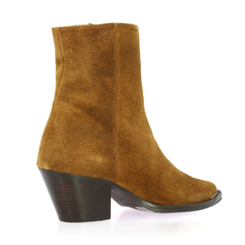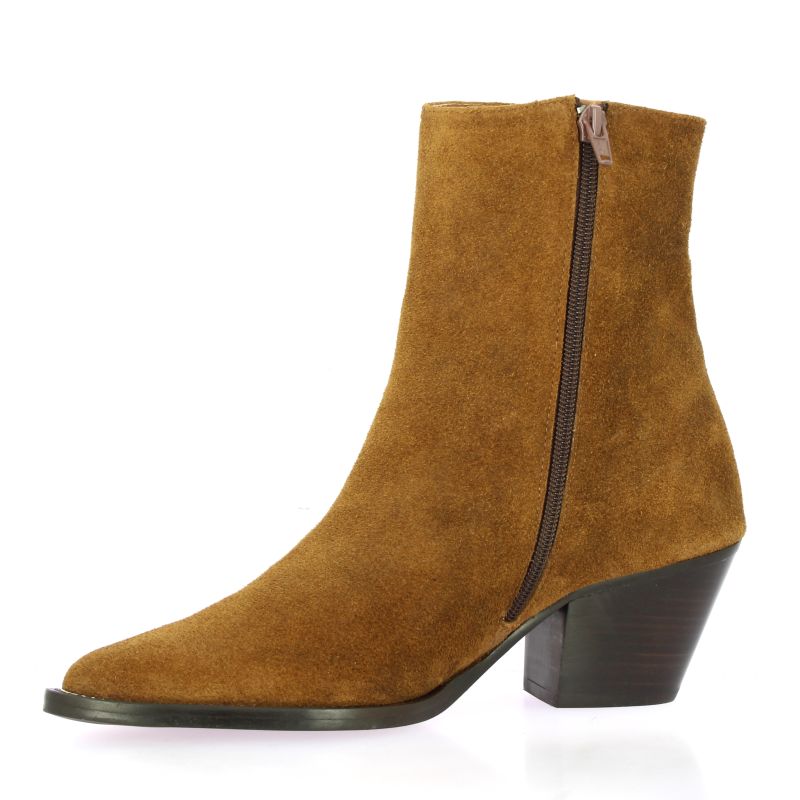 Boots Maroli à la coupe santiag, en cuir velours cognac, féminines et élégantes.