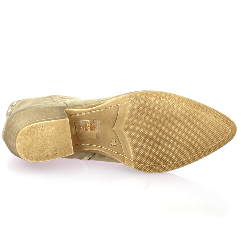 Cette bottine Pao en cuir velours couleur taupe revisite le style santiag avec une touche de raffinement.