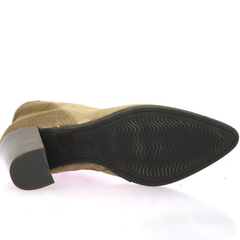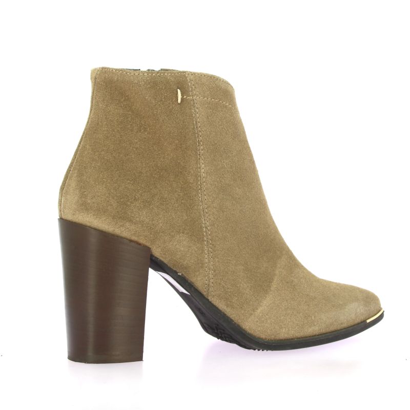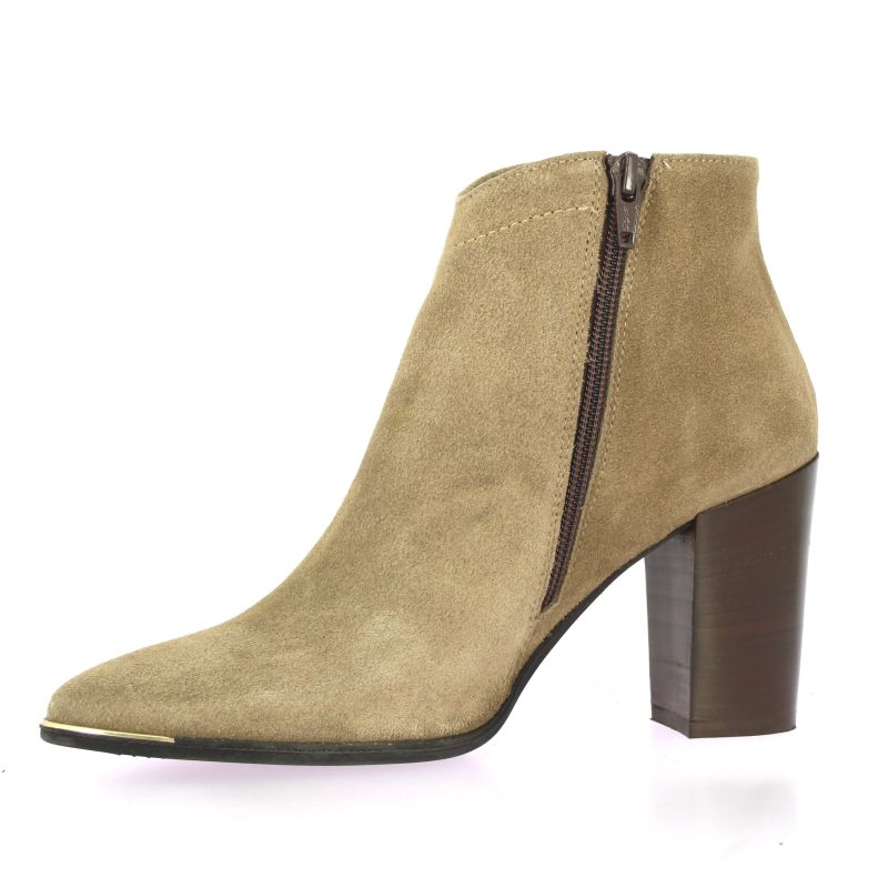 Boots Pao à haut talon en cuir velours taupe, au style féminin et moderne.