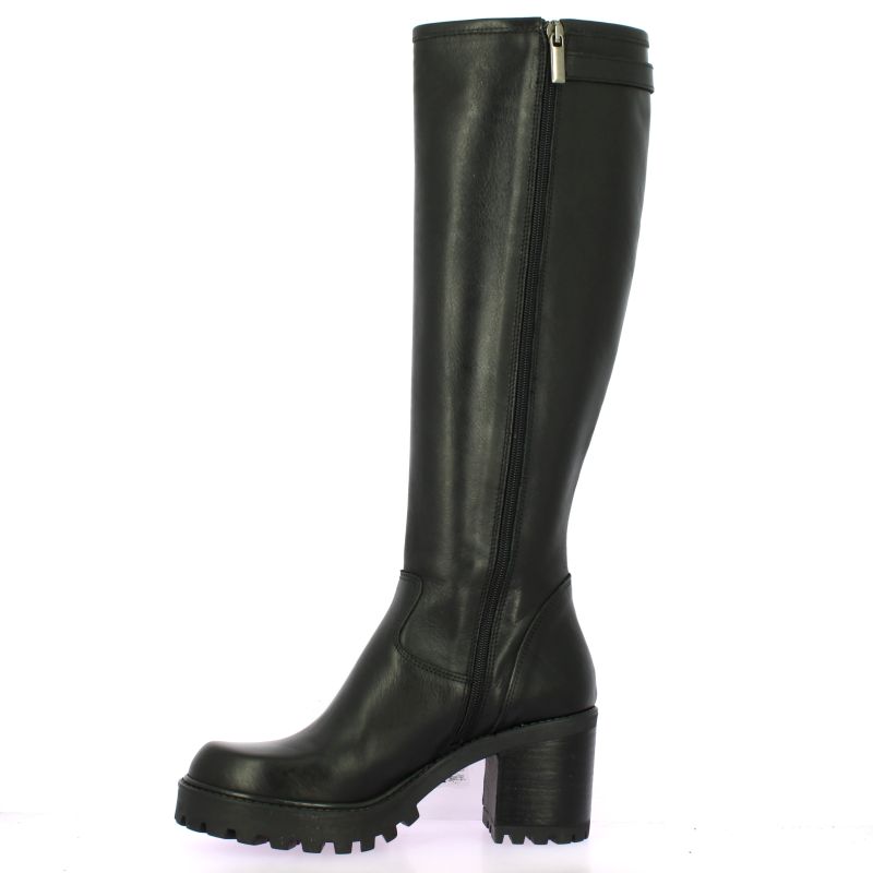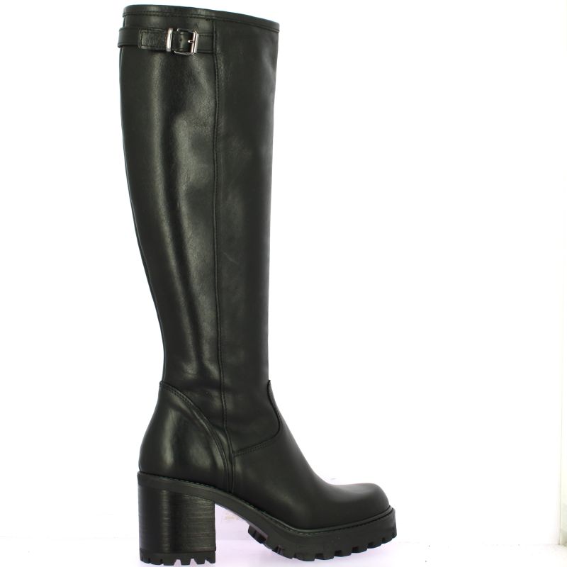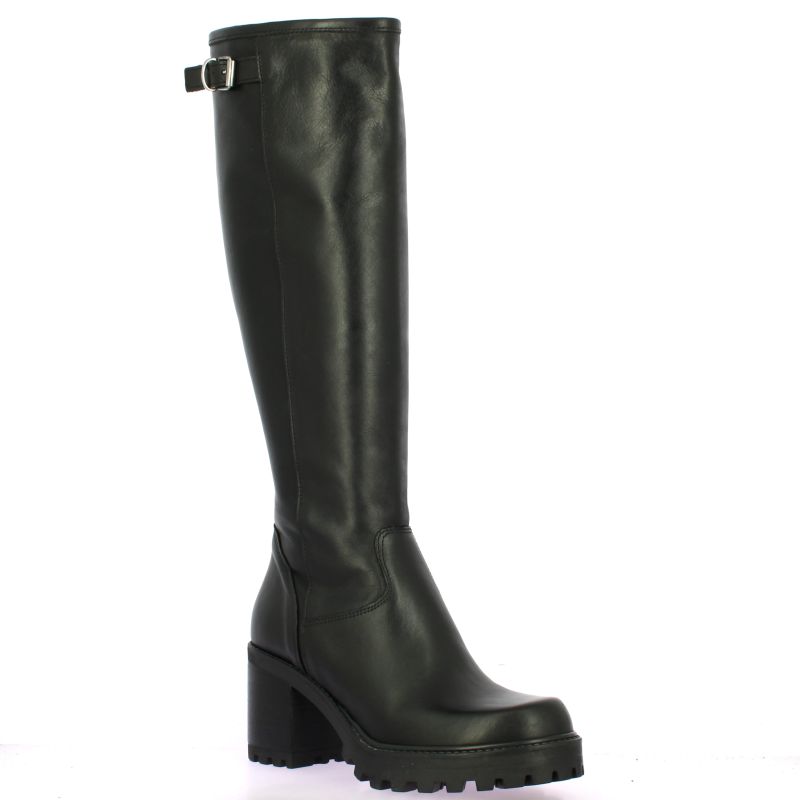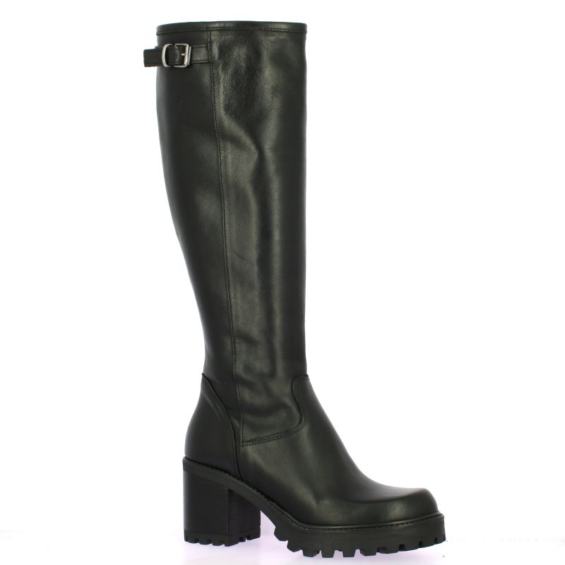 Bottes Spaziozero en cuir noir motardes au talon large, alliant confort et audace.