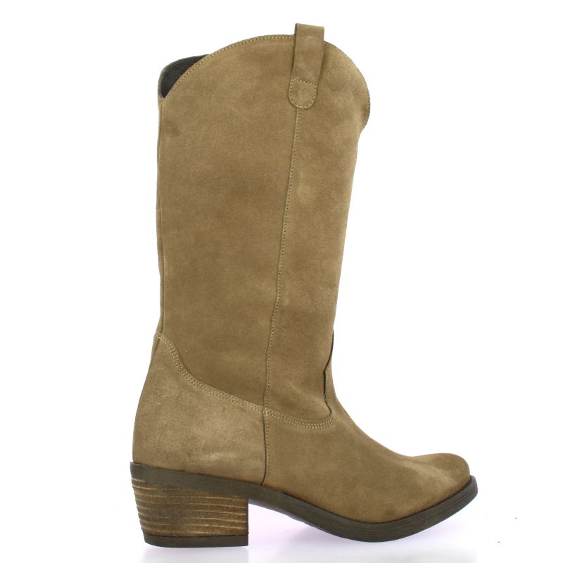 Bottes So Send en cuir velours taupe, au design inspiré des santiags.