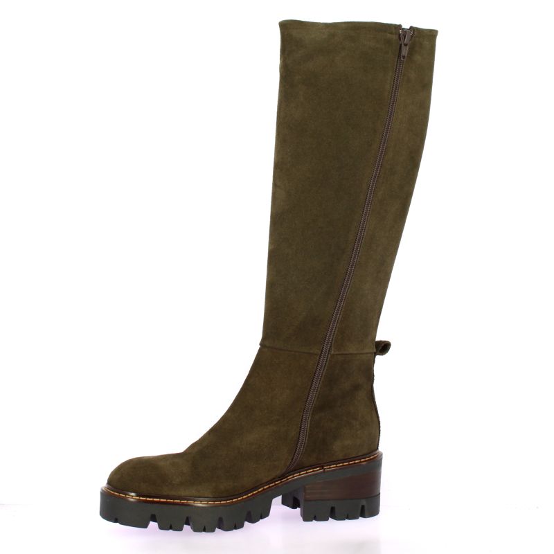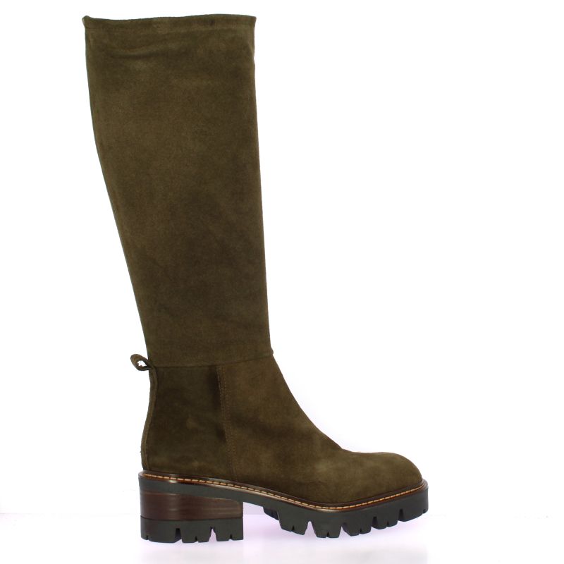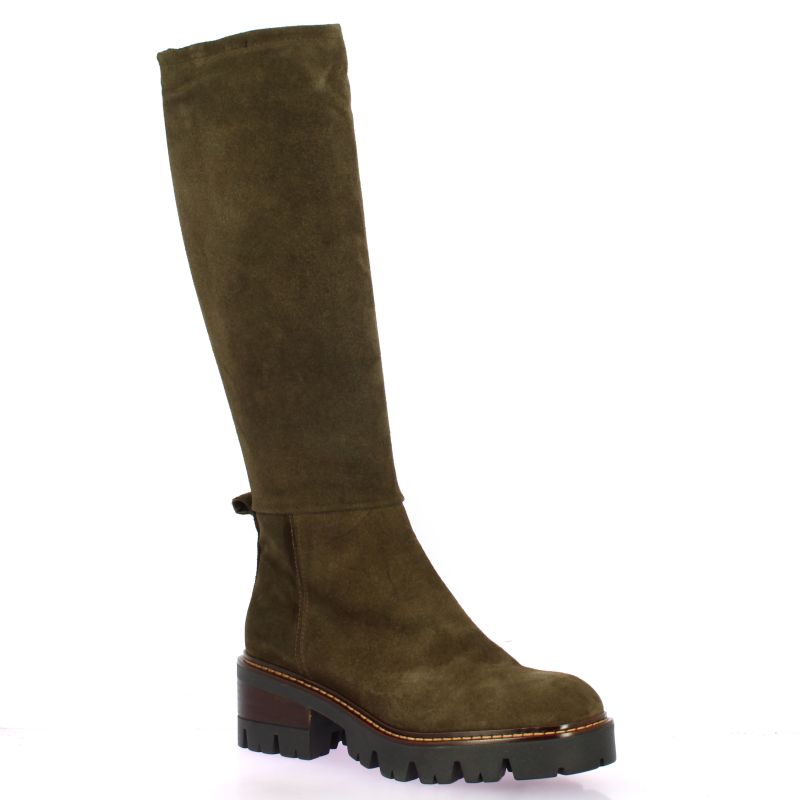 Bottes Pao hautes en cuir velours marron à la tige souple et minimaliste, sublimées par une semelle crantée contemporaine offrant confort et allure robuste.