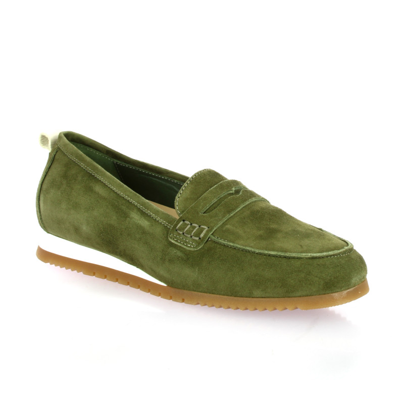 Confectionné dans un cuir velours olive profond, il se distingue par ses coutures artisanales sur le plastron et une languette d'enfilage pratique au talon.