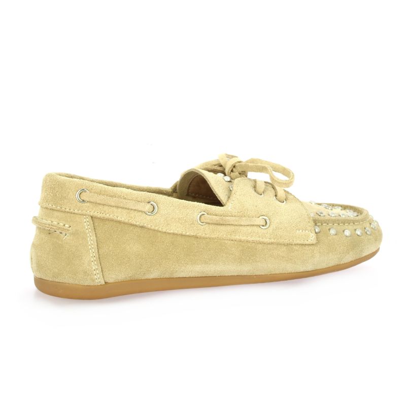 Ce mocassin souple Reqins en cuir velours beige se distingue par ses petits clous argentés qui soulignent élégamment le plateau avant.