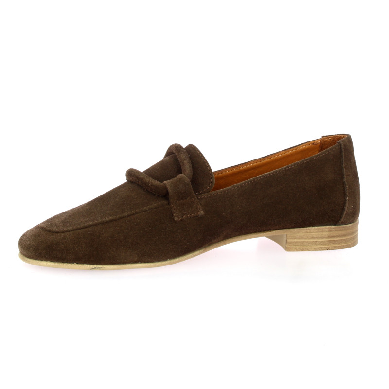 Ces mocassins Coco Abricot en cuir velours marron chocolat allient confort et élégance décontractée.
