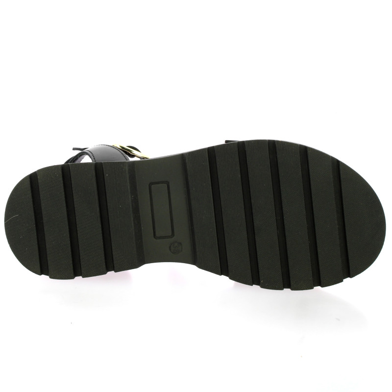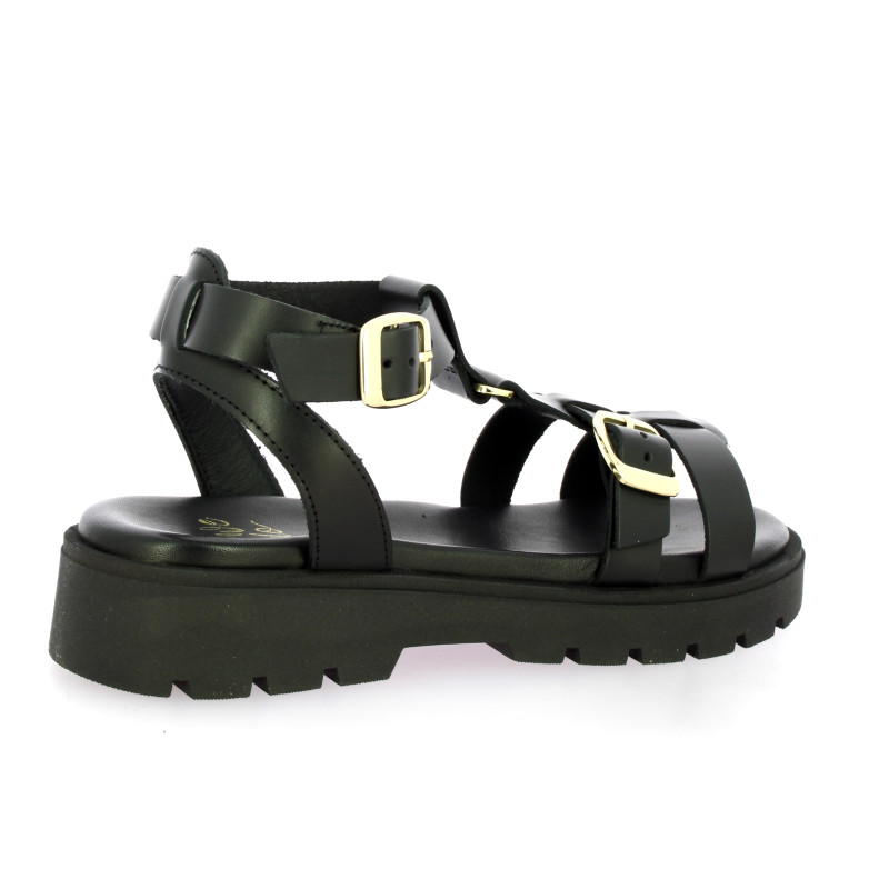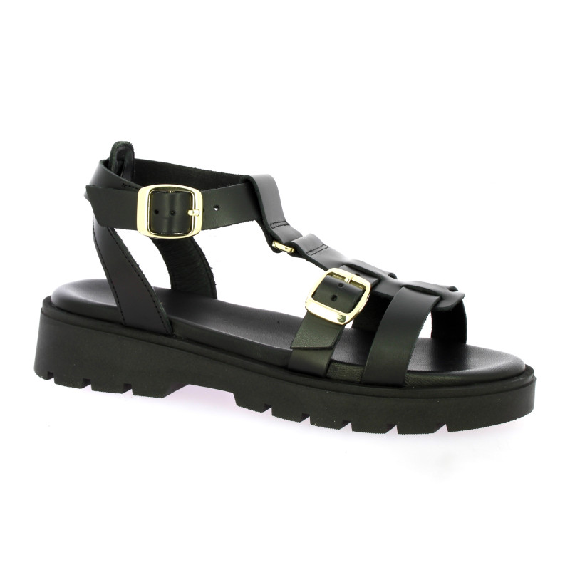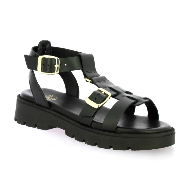 Ses larges brides en cuir noir mat sont sublimées par des boucles dorées imposantes, créant un contraste moderne et affirmé.
