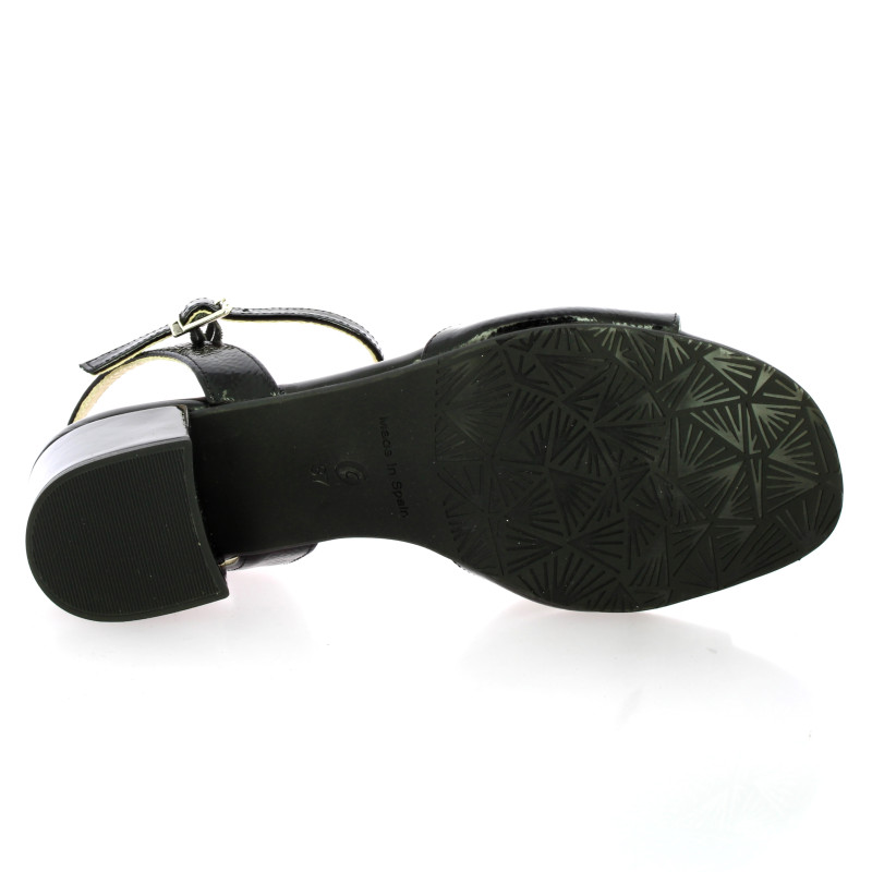 Sa structure se compose d'une large bride avant sobre et d'une fine bride cheville ajustable par une petite boucle métallique, offrant un maintien délicat.